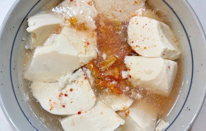 豆腐にスープをまわしかけてから、600Wの電子レンジで3分加熱します。
