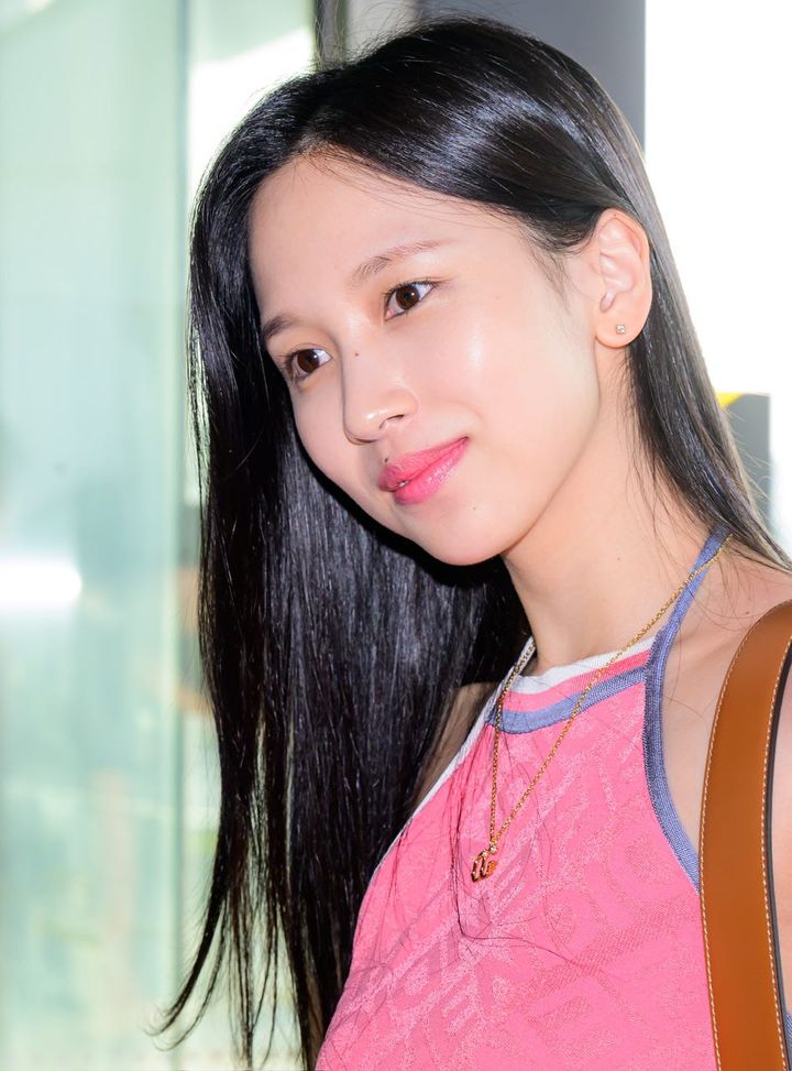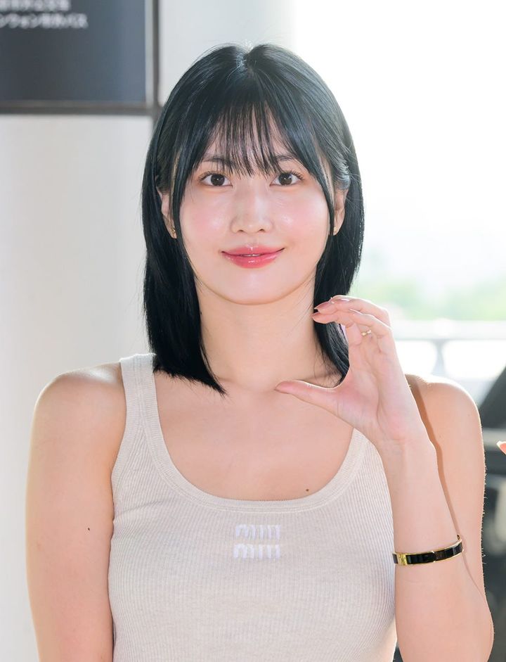 日本に向けて出国するサナは、前髪を下ろしたラフなスタイルで空港に登場。肌荒れひとつないスベスベな色白美肌は日々のスキンケアを徹底している証拠! なめらかなピーチカラーをリップのポイントでのせて、ヘルシーさと透明感をGET。