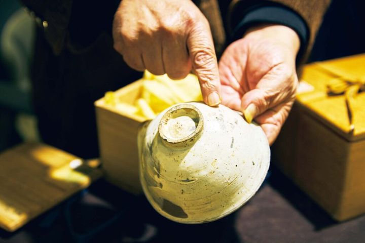 豊臣秀吉の時代に茶道具として使われていた宝城茶碗。朝鮮で作られ、日本に送られていたという。その時代の粉引茶碗。
