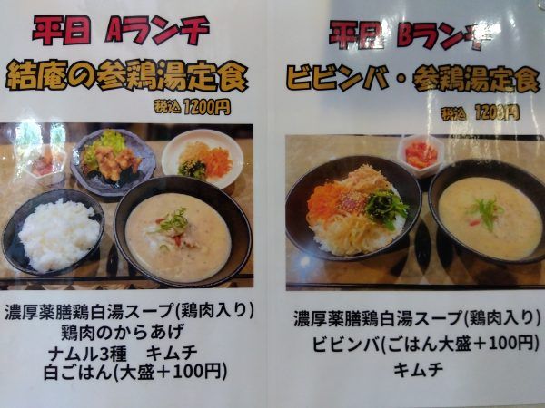 平日は、Aランチ・結庵の参鶏湯定食とBランチ・結庵のビビンバ・参鶏湯定食の2種類なんですよ。そして、1月26日からは冬季限定Cランチ・結庵の濃厚薬膳鶏白湯スンドゥブ定食も登場!すべて、ごはん大盛りは+100円。土日祝ランチは、前菜、濃厚薬膳鶏白湯スープ、参鶏湯と白ごはんの7種の薬味で食べる結庵の参鶏湯のみとなりますが、夜のメニューのお鍋、一品料理も注文可能なんですよ。
