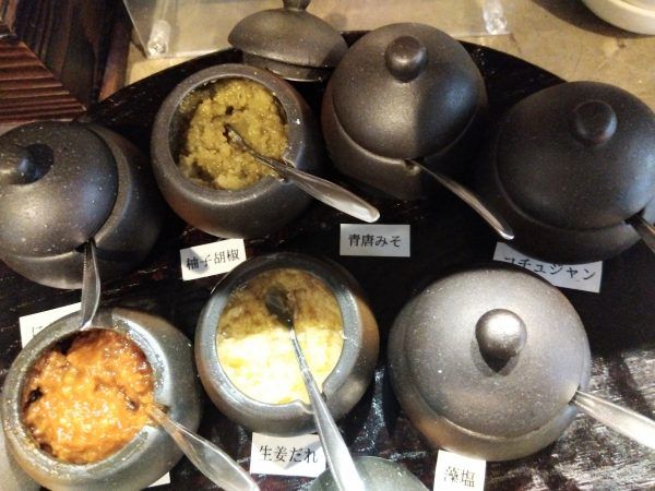 自家製ピリ辛コチュジャン、にんにく、青唐みそ、柚子胡椒、醤油麹、生姜だれ、藻塩の7種類の特製薬味が卓上に置いてるのが、ウレシイ~。オススメの特製薬味は、柚子胡椒、生姜だれ、醤油麹だそう。濃厚薬膳鶏白湯スープ参鶏湯は、何も入れないほうがオイシイのにと思いつつ、オススメの薬味を試してみると、味変最高!違った味わい、味に深みが出て、もっとオイシイ~。
