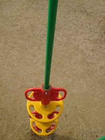 上に登るとくるくる回すことができる遊具、くるくる、くるくる、絵が面白く回りますよ。