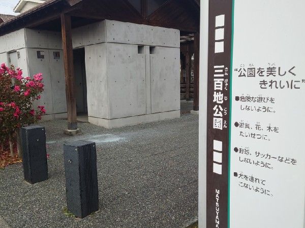 三百地公園は住宅街の中にあります。子ども達が走り回っても目視確認で位置を把握でき、私には丁度良い広さの公園で嬉しいです!注意点は、住宅街で大通りからは外れていますが車も通る場所であること、フェンスはありますが小さい子は出入り口からパッと出ると危ないですので、やはりしっかり見守りが必要です。