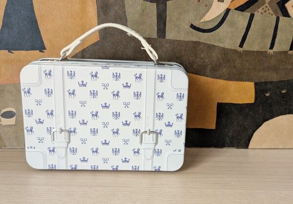 クラシカルな旅行鞄をモチーフにしたミニサイズのデザイン缶の中にチョコクランチが入っています。缶のカラーは、ホワイト、ブルーの2種。リップクリームや目薬など、ちょっとした小物入れに使用できます。
