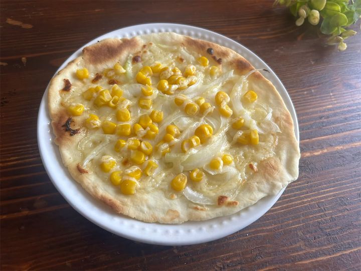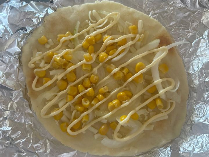 生地を焼いた後、ピザソースは塗らず、ピザ用チーズひとつかみをのせ、コーンと薄切り玉ねぎ(各適量)をのせて焼く。