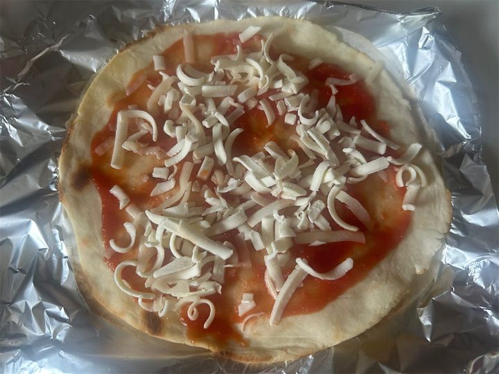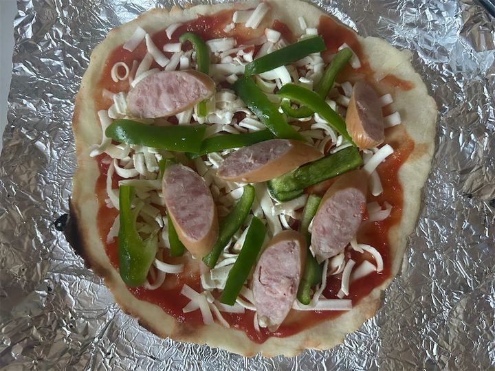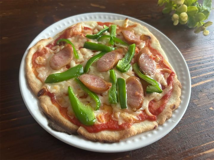 生地を焼いてから、ピザソース大さじ1を塗り、ピザ用チーズひとつかみをのせて、切ったピーマン・ウインナー(各適量)をのせて焼く。