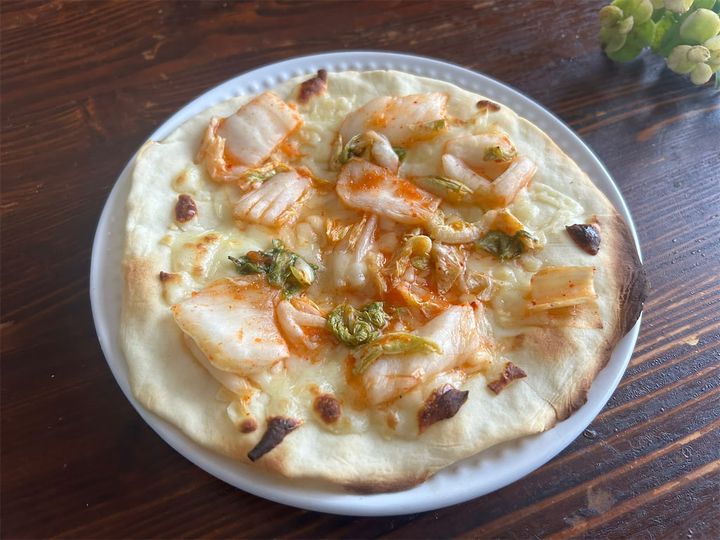 生地を焼いた後、ピザソースは塗らずにピザ用チーズひとつかみをのせ、キムチ(適量)をのせて焼く。