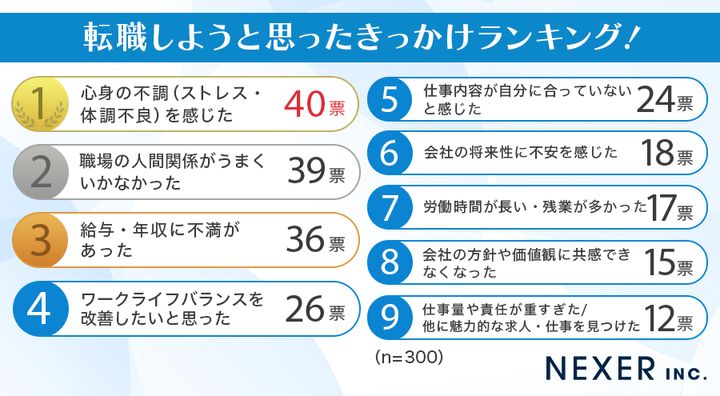 講演会講師派遣サイト「スピーカーズ」と株式会社NEXERが実施した調査をもとに、「転職しようと思ったきっかけ」をランキング形式で紹介します。
