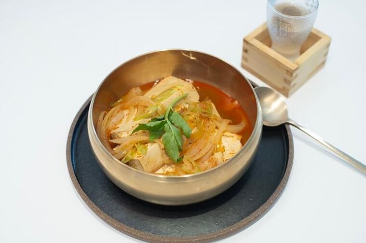 「トゥブチョリムは、家庭でよくつくられる料理です。調味料は韓国唐辛子と醤油、えごま油のみ。このシンプルな味付けは、子供の頃に毎年父親とスキー旅行で通った、江原道(カンウォンド)の食堂で食べた思い出の味を再現したものなんです。辛さは控えめで、玉ねぎの甘味やえごま油の香りを感じるスープと、その煮汁が染みた豆腐が、キリッとした飲み口の辛口純米の冷や(常温)やぬる燗と合いますよ」(ジェリョンさん)