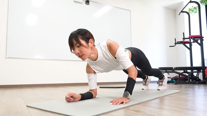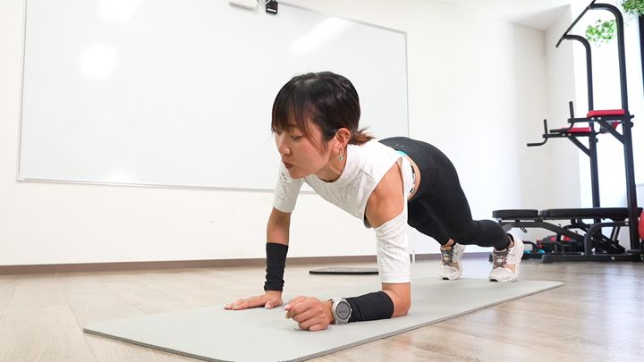 ハイプランクの姿勢から、腕の曲げ伸ばしを行います。姿勢が崩れないようにしましょう。