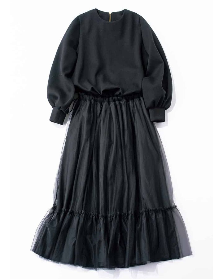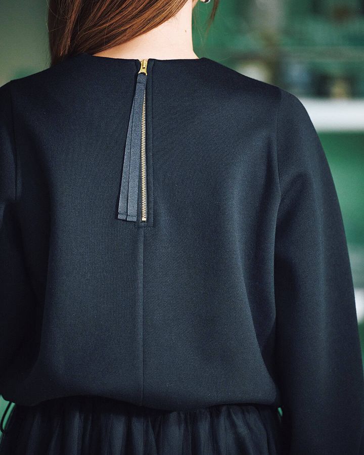 スカートとトップスをコーディネートしたように見えるワンピは、トップスにジャージーでありながらも表面感がキレイなポンチ素材、スカートにはシアーチュールを贅沢にたっぷりと使いました。後ろは開け閉めをしやすくするためのリボンやゴールドのファスナーがロマンティックムードにも一役買っています。ウエストはスピンドルゴム仕様で、調節が可能です。もちろん自宅でのお手入れが可能です。