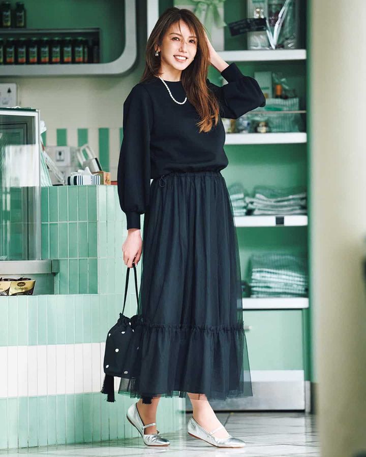 ボンディングパールフーディ¥17,600(シークレット・トロフィー)ティアードスカート¥29,700(カデュネ)バッグ¥69,300(マエストソ/オブリオ)パンプス¥30,800(ツルバイ マリコ オイカワ)ピアス¥3,080(シースキー/ロードス)