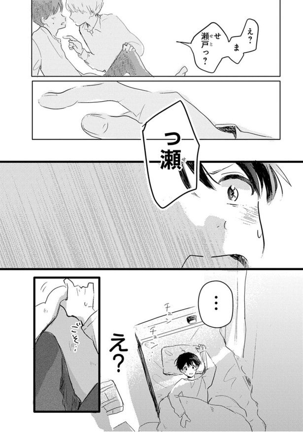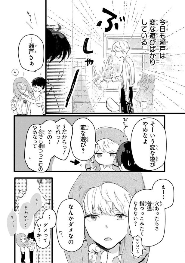 小学生の頃から変わらず変な遊びばかり思いついて西にちょっかいをかけてくる瀬戸と比べて、西は年頃の男子らしく性的なことに敏感で、瀬戸の“穴に指を入れる”という遊びも「性的な挿入」と想像し赤面。それどころか、夢にまで瀬戸が登場し、西は夢精をして起床する始末。西は、瀬戸と違って頭の中がピンクだらけの自分に落ち込んでしまう。そして、次第に瀬戸を避けるように。