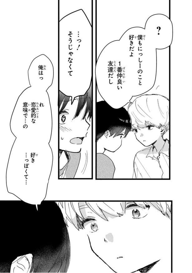 瀬戸に恋をしたことを自覚した西。西に対してあくまで友達として接する(とはいえ距離は近い)瀬戸。中学2年生という、心も身体も未成熟で個人差がある時期だからこそ、二人はすれ違う。瀬戸は恋愛感情がまだ理解できていないから、今まで通りに西に接する。しかし、それは恋心を抱く西にとっては、瀬戸が思っているよりもずっと大きな意味がある。はぐれないようにお祭りで手をつないだり、西が望む通りに口にキスをしたり、それを恋愛感情がないと言いながらしてしまう瀬戸は、ある意味残酷だ。そして、そんな瀬戸の態度に西が何も思わないはずもなく……次第に二人の間には溝が生まれていく。
