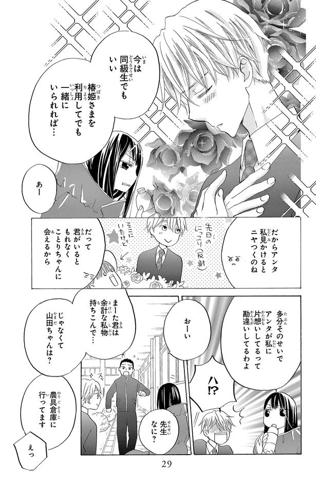 主人公・山田ことりは平凡な女の子。一方子どもの頃からの幼馴染である菊若椿姫は赤いバラのような高貴な美女。ふたりでいるとみんな椿姫に注目し、ことりの存在は気付かれずにぶつかられてしまう始末……。しかしことりは全く意に介さず、それどころか友人の美しさを認め「近くにいられて眼福!」と思うほど。そんなことりの心の綺麗さに、読んでいるこちらも心が洗われる。