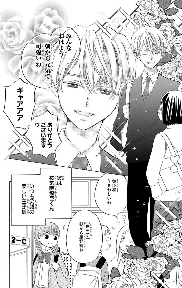 クラスにいるもうひとりの“花”が白王子こと桜来院煌臣。いつも笑顔でキザなセリフもさらっと言ってのける、学校の王子様だ。そんなふたりに挟まれた席で高校生活を送ることり。