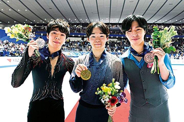 ジュニア時代から上位を競ってきた3選手。2025年全日本選手権で1位の鍵山優真選手(中央)、2位の佐藤駿選手(左)、3位の三浦佳生選手(右)。ケガに悩まされた時期を経て、ついに揃って念願の五輪へ。
