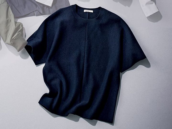 センターシームで地味見えしないニット。ボトムスとの相性も良くワンツーコーデの完成度が高まる。体のラインを拾わない点も優秀。