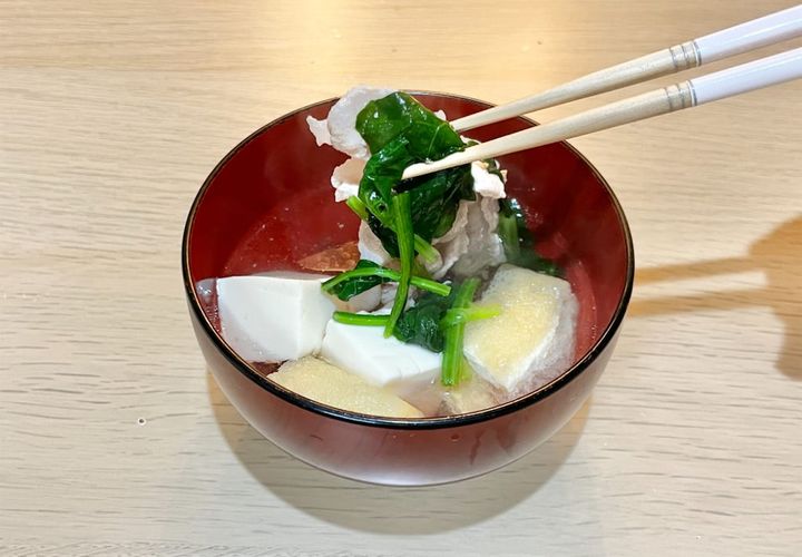 透き通ったスープの中に、豆腐と豚肉とほうれん草の緑が浮かんでいて、和の風情が漂っています。