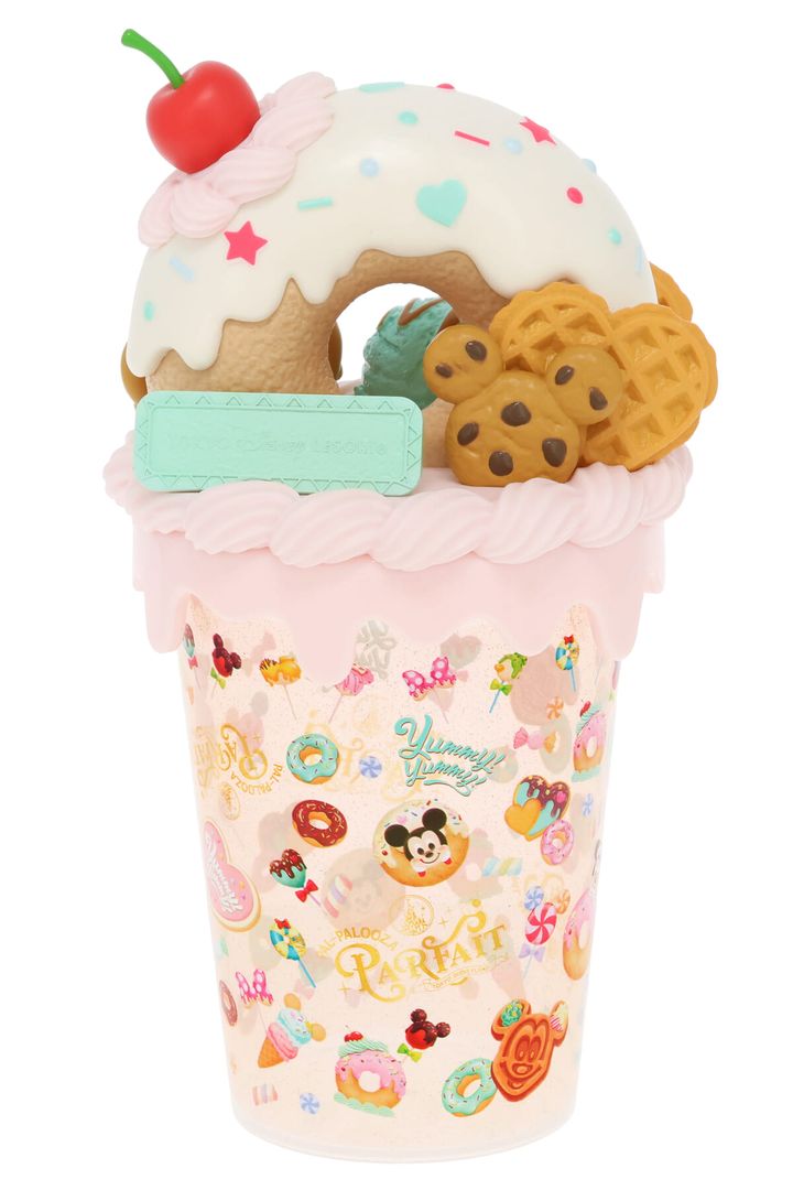 ホイップクリームやドーナツ、ミッキーシェイプのクッキーなどがトッピングされたフタがインパクト抜群のパフェカップ。