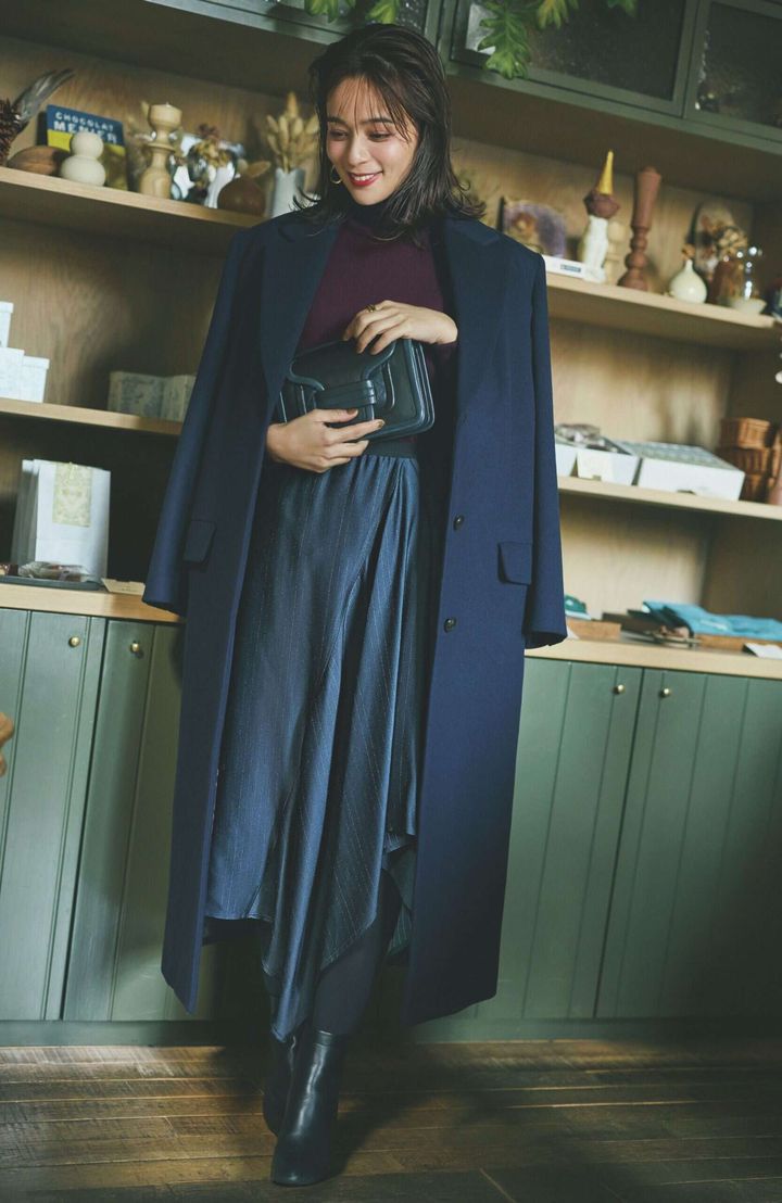 バッグ¥157,300(ピエール アルディ/ピエール アルディ東京)スカート¥49,280(TELA/ティースクエア プレスルーム)コート¥69,300(ジャーナル スタンダード レサージュ/ジャーナル スタンダード レサージュ 銀座店)ニット¥29,700(サクラ/インターリブ)ブーツ¥97,900(ペリーコ/アマン)ピアス¥41,800リング¥46,200(ともにブランイリス/ブランイリス トーキョー)タイツ/スタイリスト私物