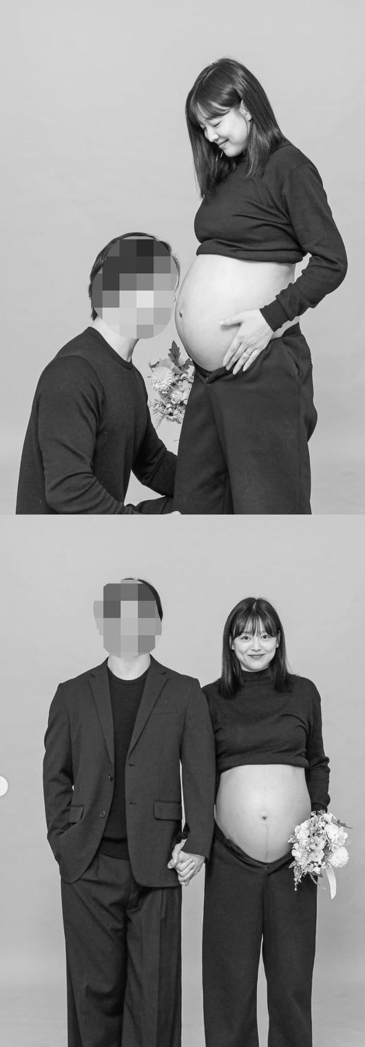 それらのマタニティ写真には、お腹のラインが自然に現れる衣装を身にまとい満面の笑みを浮かべたり、夫がお腹を見つめながら手を握り合ったりする、ささやかだが温かい瞬間が切り取られている。モノトーンで演出されたカットでは、より落ち着いた端正な雰囲気が際立っている。