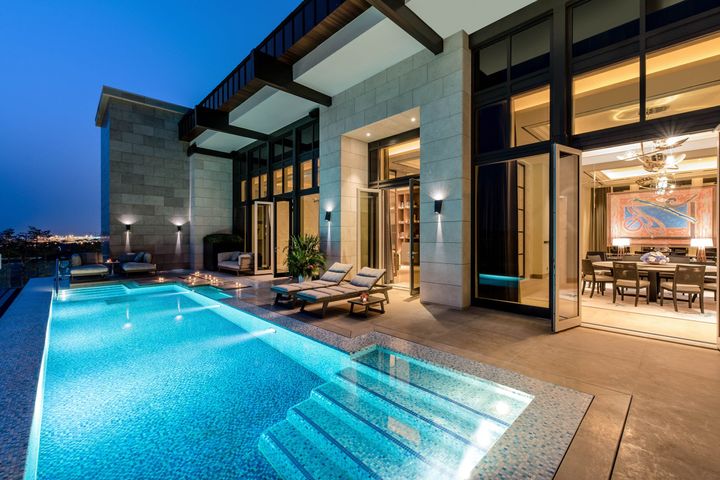 <写真>プールヴィラタイプの最大の特徴でもある、プライベートプールで都市にいながらもリゾート気分を味わえる。日が暮れるとライトアップされ、よりロマンチックな雰囲気が広がる。
