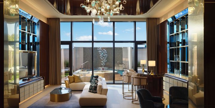 シャンデリアやベロア素材など、きらびやかな要素が詰まった3室のみの「ロイヤルスイート」。この客室ではオーディオシステムにもこだわっているので、パーティーシーンにもおすすめ。4種類のスイートルームは、少しずつインテリアの趣も異なるので好みやシーンに合わせて選びたい。