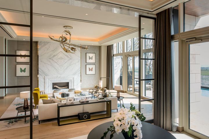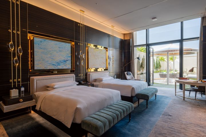 ホテル内の最高級客室で942㎡を誇る「グランドデラックスプールヴィラ」のリビングルーム。エクリュやウッドでまとめられた空間に、アクセントカラーのチェアやツヤ感のある照明や小物が映えるラグジュアリーなインテリアが特徴だ。大胆に採られた窓のおかげで、内と外が緩やかにつながる開放的な空間が広がっている。
