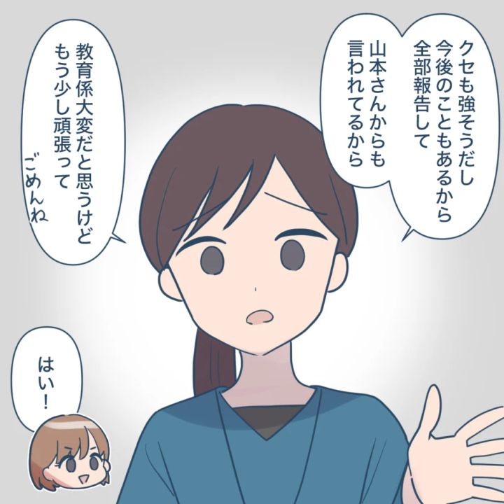 「クセも強そうだし、今後のこともあるから全部報告して。山本さんからも言われてるから。教育係大変だと思うけどもう少し頑張って。ごめんね」と申し訳なさそうに言う藤澤さんに、「はい!」と返事をしたのでした。