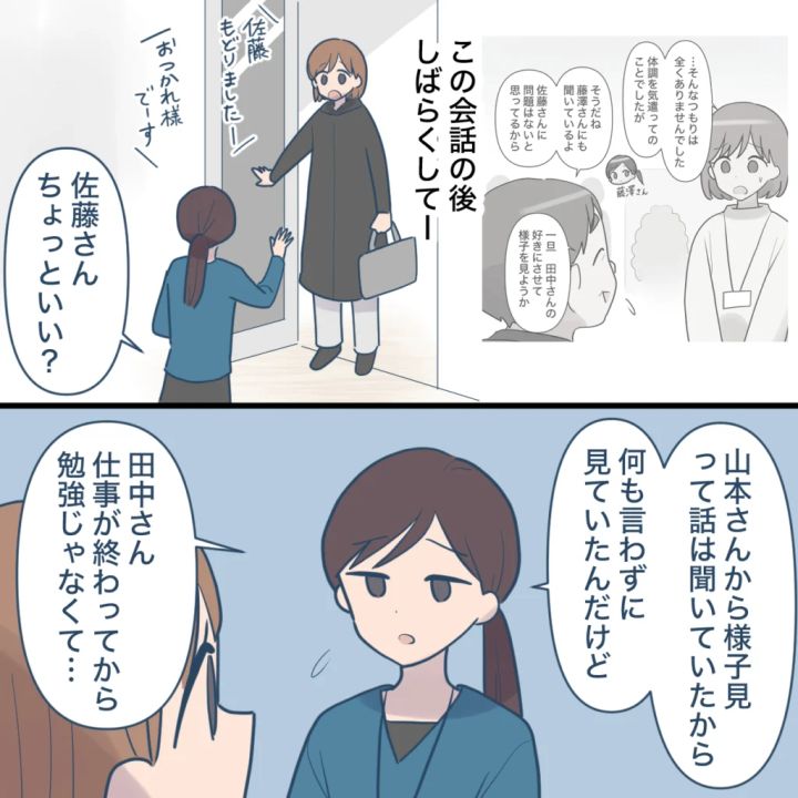 「佐藤さん、ちょっといい?」と藤澤さんに呼ばれ、「山本さんから様子見って話は聞いていたから、何も言わずに見ていたんだけど、田中さん、仕事が終わってから勉強じゃなくて・・」