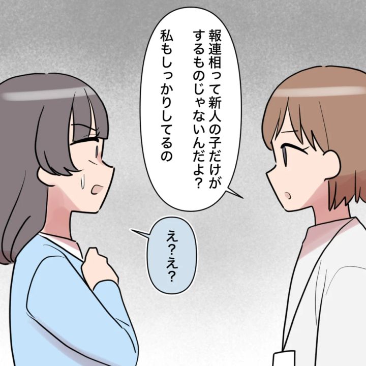 結衣さんは娘のスイちゃんを迎えに行った保育園で、以前同じ職場で働いていた後輩田中さんを見かけて驚きます。数年前、新入社員として入ってきた田中さんの教育係だった結衣さんは、田中さんの言動に振り回され大変な目に遭ったのです。田中さんは意味もなく残業をしたり、結衣さんが作った資料を自分が作ったかのように装ったり、少しでも注意されるとデタラメを言って自分が被害者かのように振る舞いました。そんなある日、結衣さんが担当していた得意先のプレゼンを任された田中さん。しかし、田中さんはプレゼン当日に体調不良で欠勤。こうなることを予想していた結衣さんと藤澤さんは何とかプレゼンを切り抜けて一安心。出社してとぼける田中さんに「人の資料を自分が作ったように見せかけるのは違うかな」と藤澤さんが笑顔で言うと、結衣さんを責める田中さん。自分は仕事ができるとみんなが褒めてくれると泣き出す田中さんに、「報連相を知ってるなら、私も上司や先輩に報告してるってどうしてわからないのかな?」結衣さんが静かに言いました。