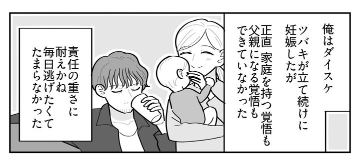 俺はダイスケ。付き合っていたツバキが妊娠したと聞いたとき、正直なところ俺には家庭を持つ覚悟も父親になる覚悟もできていなかった。しかし人生は待ったなし。あれよあれよという間に、俺の人生に妻と子どもが転がり込んできた。しかも1人目が生まれたらすぐに2人目が……。金はかかる一方だし、先のことなんて考えたくない。その頃の俺は、現実から逃げたくてたまらない気持ちだった。そんなとき実家で弟から、思いがけない話を聞かされた。