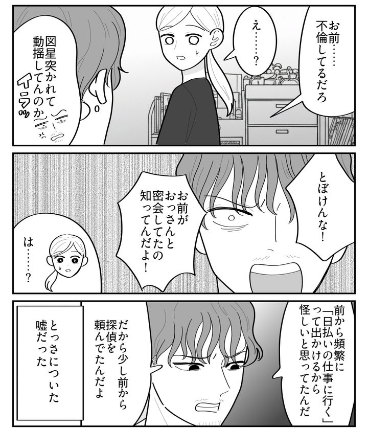 問い詰めればツバキも不倫の事実を認めるだろうと思った。しかしツバキは口を割らない。だからとっさに嘘をついた。「否定してもムダだ、探偵に頼んでいたから証拠もある」こうなったら、俺ももう言葉を引っ込めるわけにはいかない。
