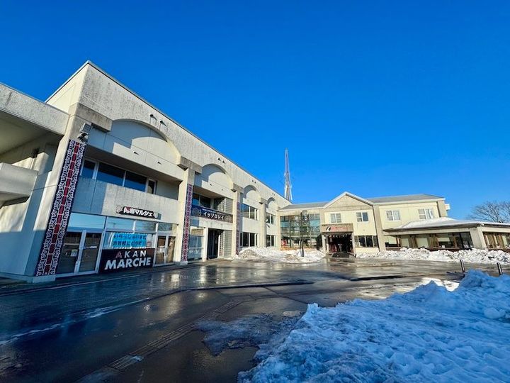 丹頂の里に到着してまず目につくのは、日帰り入浴が可能な温泉「赤いベレー」や、特産品を販売する「阿寒マルシェ」が入っている大きな建物です。