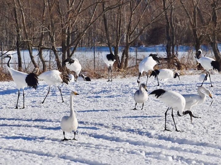 給餌場にはたくさんのタンチョウと白鳥がいました。すごい!