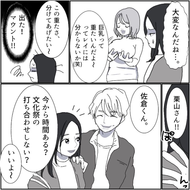 スレンダーでモデル体型の主人公・レイ。同級生のマミはレイとは正反対のスタイルで、豊満ボディが自慢なようだ。そのせいで、何かとレイに対して体型マウントを取ってくることが多かった。そんなある日、マミが狙っている男子・佐倉くんと、文化祭の実行委員がきっかけで親しくなったレイ。2人の仲の良さが気に食わないマミは、なんとレイに対してあからさまな嫌がらせをすることに!?