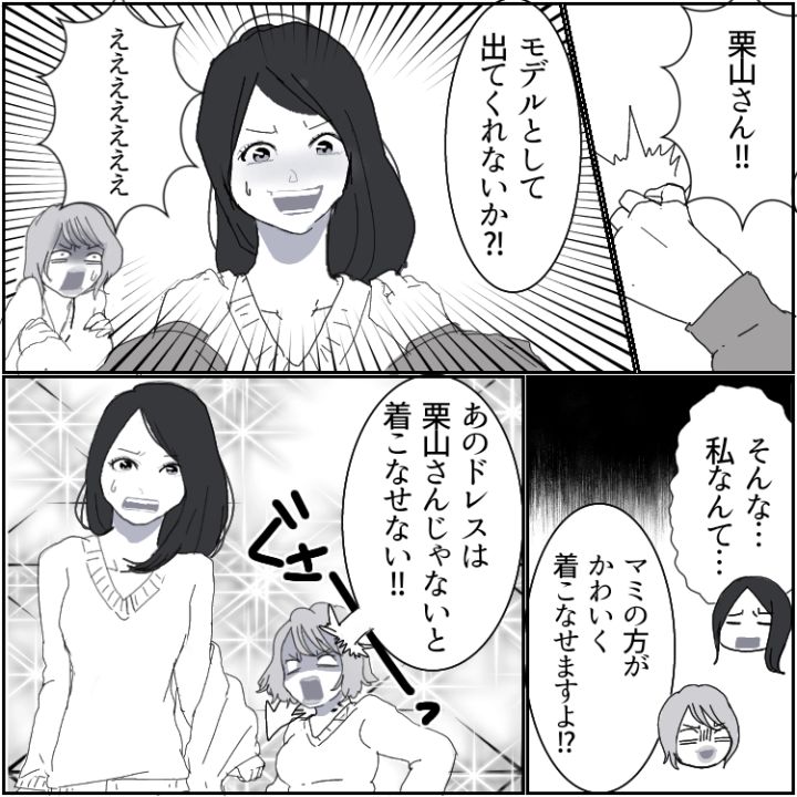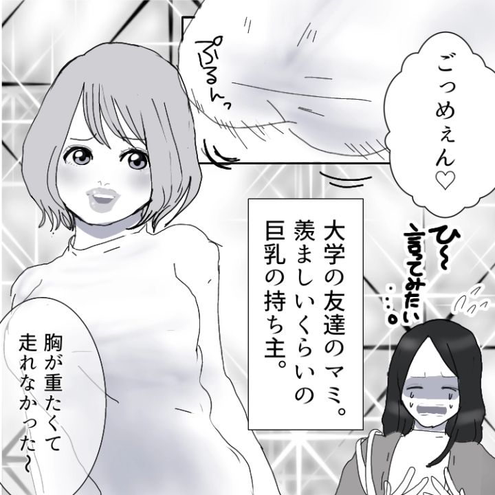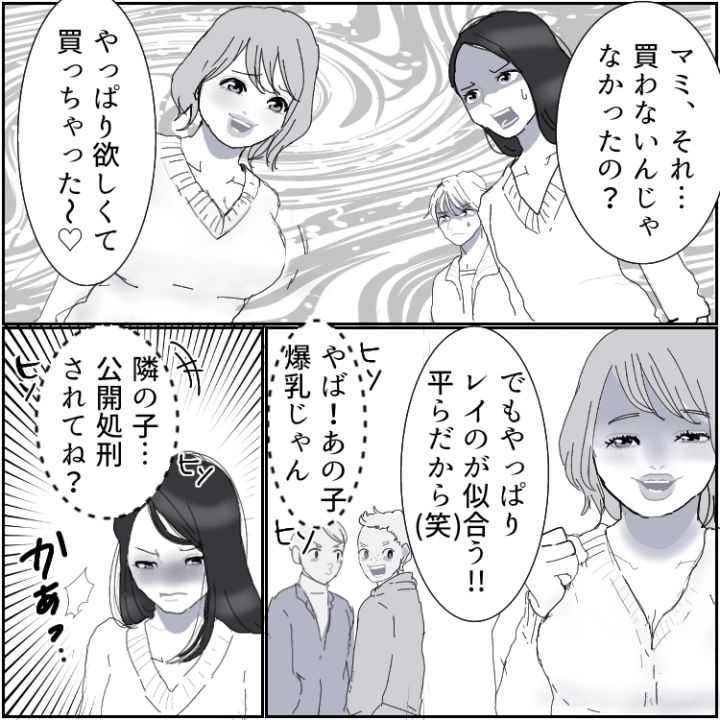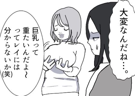 スレンダーでモデル体型の主人公・レイ。同級生のマミはレイとは正反対のスタイルで、豊満ボディが自慢なようだ。そのせいで、何かとレイに対して体型マウントを取ってくることが多かった。