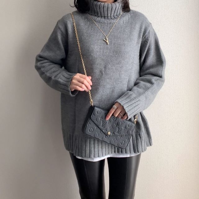 タートルネックの厚手ニットには「ペンダントトップ付きのロングネックレス」がイチ押し。このとき長さ60cm以上のネックレスチェーンを選ぶのがおすすめ。厚手のタートルネックニットにネックレスが自然に収まります。ペンダントトップの重さでネックレスがVゾーンをつくり、スマートなルックスに。