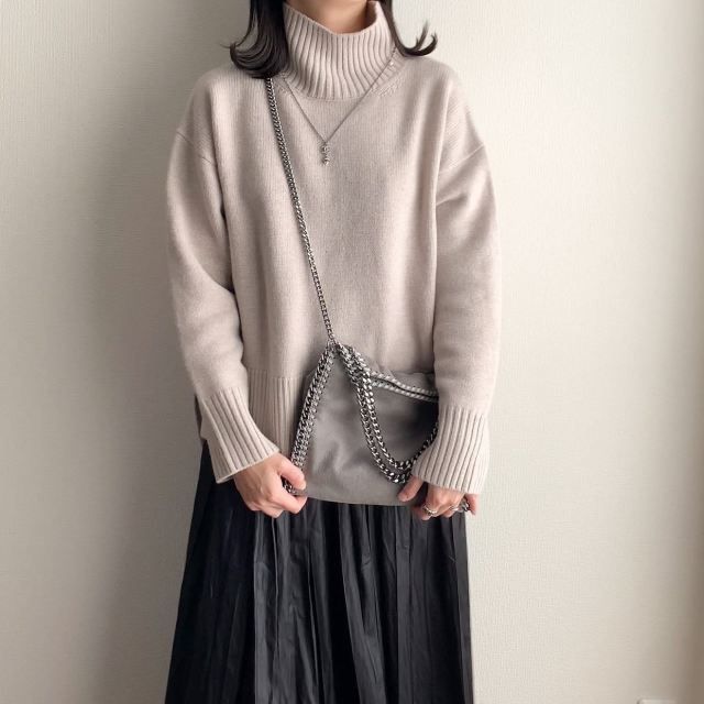 ハイネック・モックネックの厚手ニットにぴったりなのは「シルバーのネックレス」。首元が詰まったニットをクールな印象のネックレスが引き締め、コーデがスッキリ見えします。ハイネック・モックネックのニットは首まわりに厚みがあるので、ネックレスチェーンの長さは55cmくらいがおすすめです。