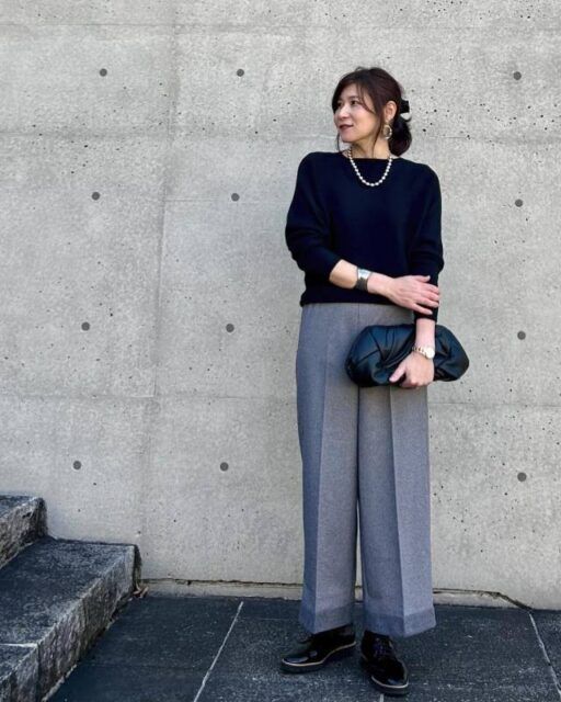 ネックラインが浅く横長に開いたボートネックの厚手ニットに似合うのは「ボールチェーン・パールのネックレス」。パールやメタリックボールを連ねたチェーンは存在感があり、寂しくなりがちなボートネックにハマります。シンプルですがサマになる着こなしに。