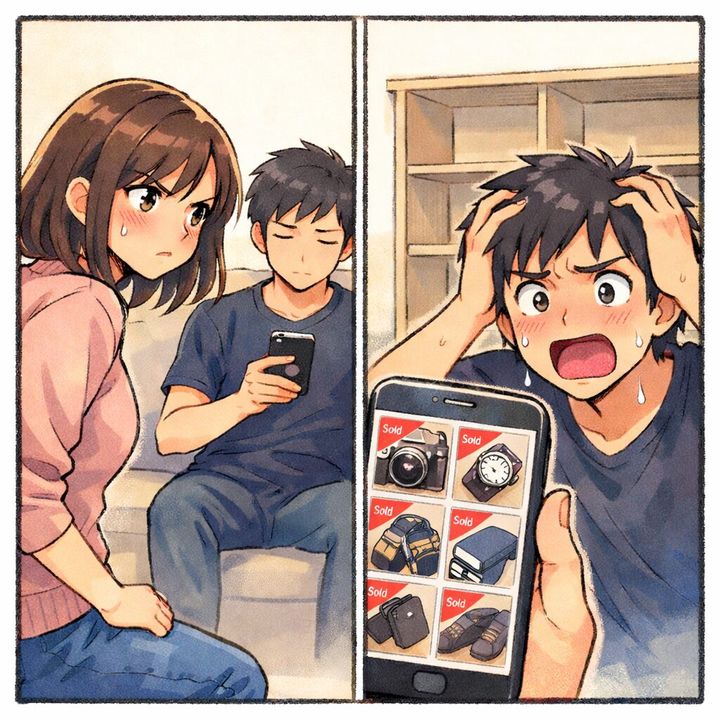 彼が帰宅して、空っぽになった棚と、自分の宝物が激安で売られた事実を知った時、一体どんな顔をするでしょうか。
