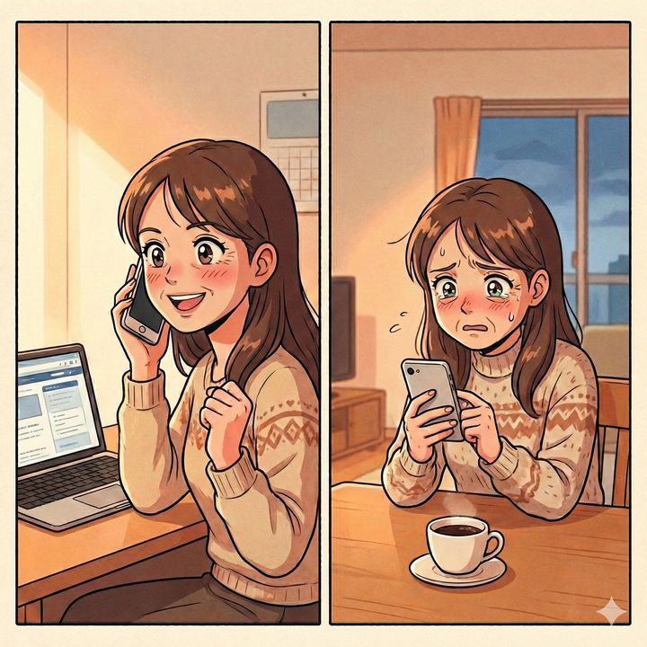 通話が切れた黒い画面には、自分の力で解決できた、晴れやかな私の顔が映っていました。