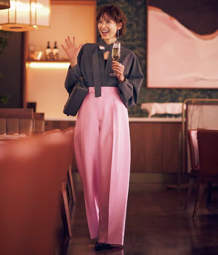 少しずつ子どもの手が離れ、オシャレも自分軸へ回帰。久々のナイトアウトは頑張りすぎず、テクいらずなのに着ていてアガるワンツーに。アクセみたいなボタンが目を引く華やかブラウスは深Vの抜け感もポイント。カラーパンツで茶目っ気をプラスして親近感のあるスタイルに。