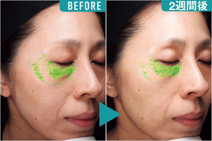 くすみと目の下のたるみが軽減し、目の開きもアップ。目元がしっかり保湿され1週間後には目まわりの小ジワが浅くなった実感も。VISIAでも効果が裏付けられ目元のシワの改善が顕著に現れた結果となりました。