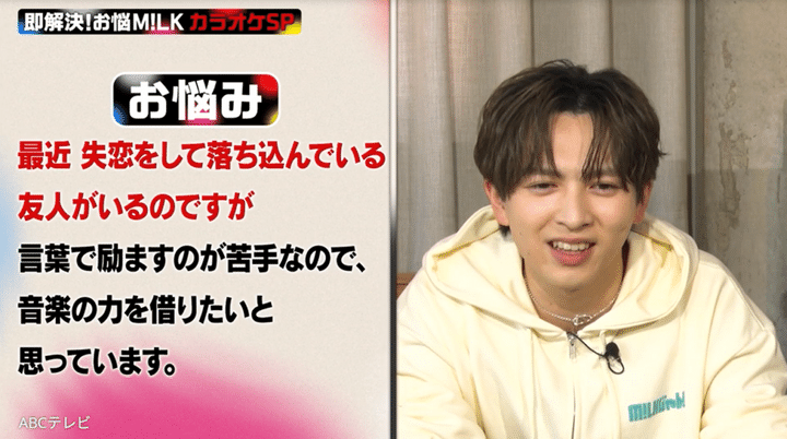 『NHK紅白歌合戦』を盛り上げた5人組ボーカルダンスユニット・M!LKの佐野勇斗が、恋人と破局して落ち込んでいる!? ……という設定で、カラオケ企画を実施。リーダーの吉田仁人が、有名失恋ソング『別の人の彼女になったよ』を歌って慰めると、強がっていた佐野がむせび泣きだし……!?