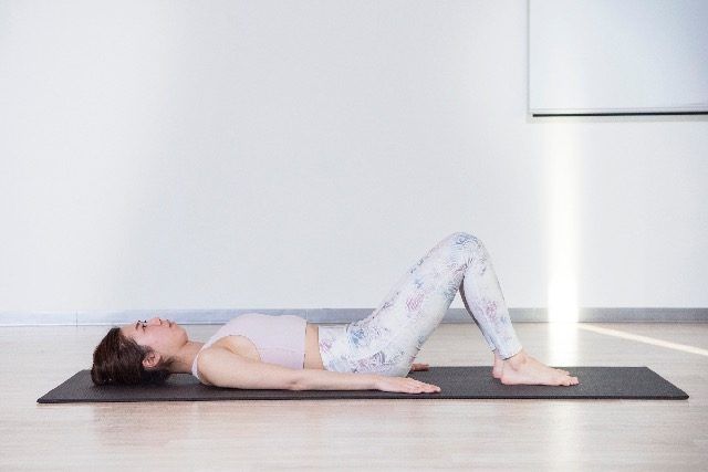 (1)仰向けに寝て、脚の幅を握りこぶし1つ分に開けてひざを立てて両腕を体側に置く