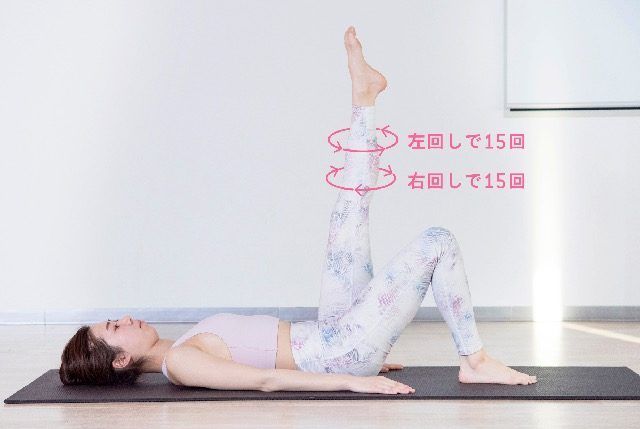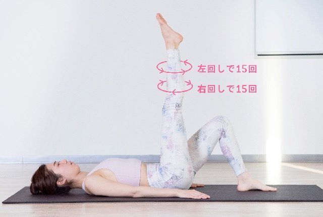 (3)右脚を伸ばして足のつま先を天井方向に向け、脚の付け根から小さく円を描くようにして動かし、外回しと内回し各15回行う