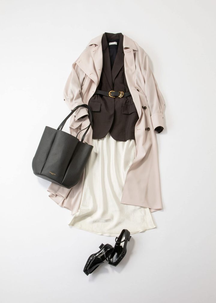 ボトムスは広がりすぎないサテンスカートで、さりげなく奥行きをプラス。ピンクベージュのコートで全体をまろやかにまとめつつ、バッグと靴は黒で引き締めて大人バランスに。