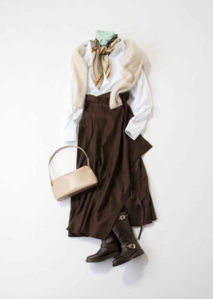 ボトムスは、リネン生地を贅沢に使ったドラマチックなロングスカートに、同色のロングブーツでつなげて脚長バランスに。スカーフに入った色を拾って全体をまとめれば、調和が取れて大人の余裕が漂います。